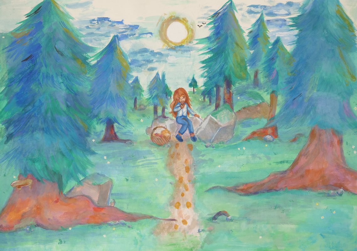 Ein gemaltes Bild. Dargestellt ist ein Mädchen mit Pilzkorb, das auf einem Felsen auf einer Waldlichtung sitzt.